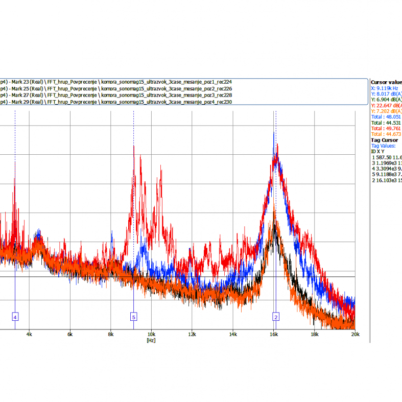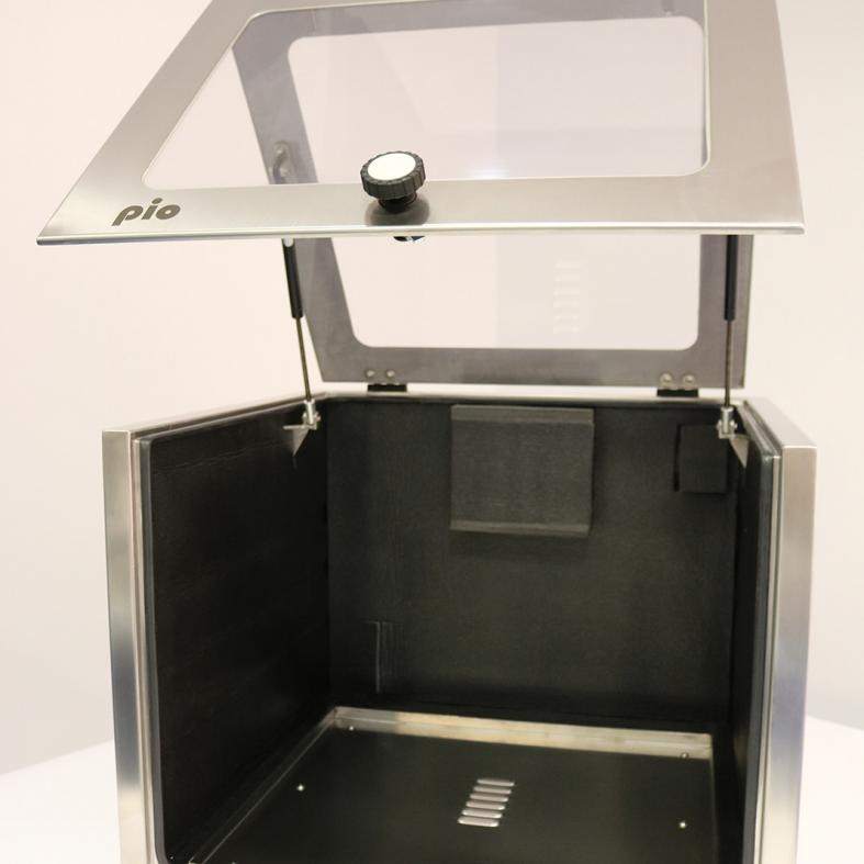 Gennem gennemsigtige overflader er det muligt at overvåge forholdene inde i kammeret uden at åbne låget. Indsættelse af enheden i kammeret er meget nemt gennem dette store låg. Gasfjedre, der er indbygget i låget, gør åbningen lettere for brugeren, samtidig med at låget holdes åbent i den øverste position uden brugerens hjælp. En speciel låseanordning sikrer, at låget er korrekt lukket, så ingen støj slipper ud. Tilslutning af apparatet til strømforsyningen udgør ikke noget problem, da kammeret på bagsiden har en dobbelt lås, hvor strømledningen kan installeres. Låsens design forhindrer dog, på trods af strømledningen, at støj slipper ud til omgivelserne. Der er også en bakke nederst, der holder eventuelle væskeudslip oppe.