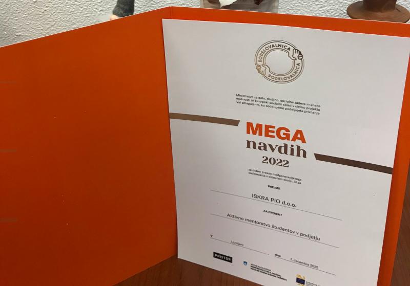 Unter der Schirmherrschaft des Projekts und dem diesjährigen Motto „WIR ALLE GEWINNEN, WENN WIR ZUSAMMENARBEITEN“, das vom Ministerium für Arbeit, Familie und Soziales organisiert wurde, erhielt das Unternehmen Iskra PIO neben einigen anderen renommierten slowenischen Unternehmen, die Auszeichnung MEGA Inspiration 2022. Die Anerkennung wird von einer Expertenkomission an Unternehmen verliehen, die mit einer bewährten Praxis der generationsübergreifenden Zusammenarbeit im Arbeitsumfeld anerkannt sind. Unser gemeinsames Ziel ist es, zu einem stärkeren Bewusstsein aller Generationen für die Bedeutung der gegenseitigen Zusammenarbeit und des lebenslangen Lernens beizutragen. Unterstützer der Idee und vor allem der Aktionen sind die Handelskammer Sloweniens, die Handwerks- und Unternehmenskammer Sloweniens und der slowenische Personalverband.