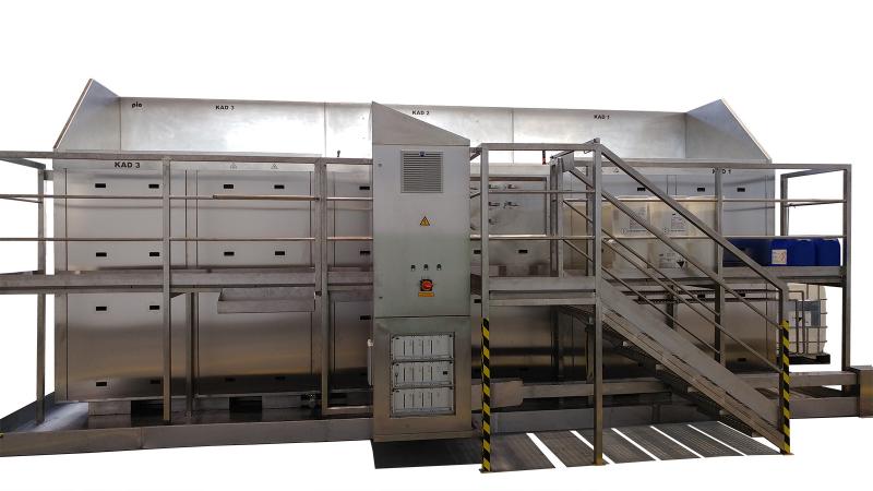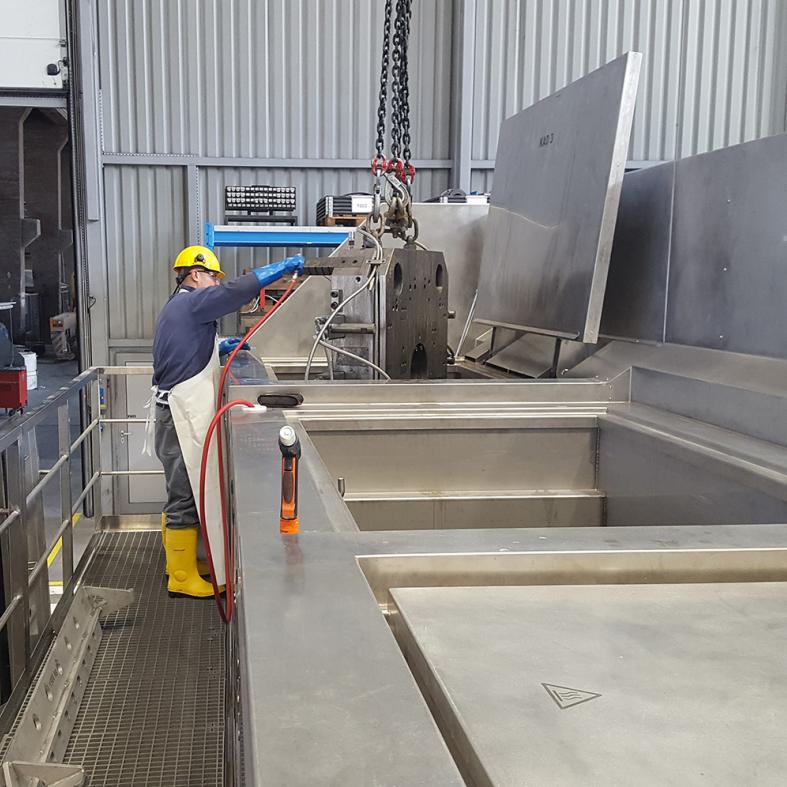 - Spülen in entmineralisiertem Wasser mittels Ultraschall und / oder fließendem Wasser über Düsen, Überlauf